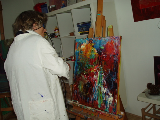 Het atelier van The Art of Mediation, Angerechtsweg 4 te Blaricum staat open voor een ieder die dat eens wil ervaren. Ezels en schildersmaterialen zijn aanwezig. (zie foto: cursist aan het werk)
